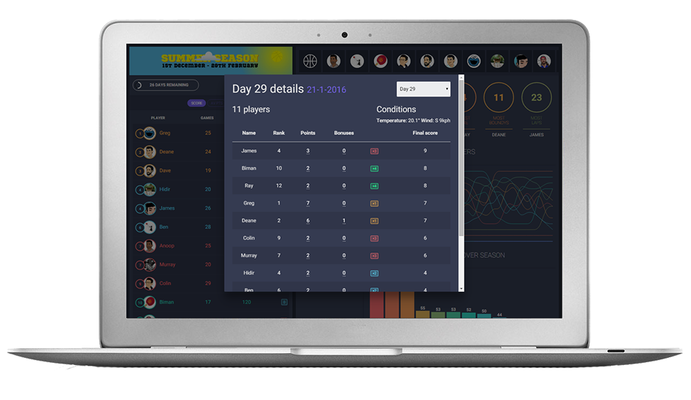 A custom scorekeeping web app for a variation on the 'around the world' basketball game. Scores can be updated live whilst playing by accessing the mobile scorer view. The app also pulls live weather data from Australia's Bureau of Meteorology.